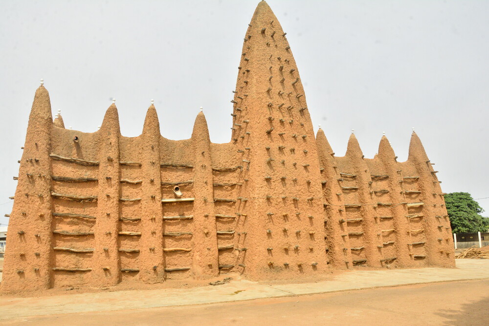 現存するモスクの多くは17~19世紀に築かれ、日干し煉瓦による厚い壁、外壁に突き出す丸太のはしご状支柱、通気と採光を兼ねた小開口、切頭ピラミッド形の高いミナレット、円錐形のキブラ塔など独特の造形が見られます。これらの建物は、気候に適応した土造建築の高度な技術と、商人がもたらしたイスラーム建築の理念が調和した顕著な例であり、地域社会の礼拝空間として今も守られています。